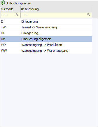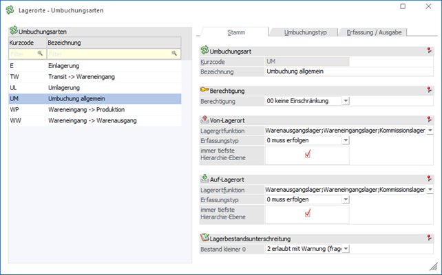 … können die Umbuchungsarten für das Programm "Lagerorte umbuchen" angelegt und geändert werden.