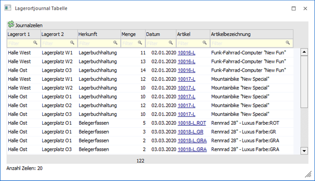 In der Tabelle werden alle selektierten Journalzeilen angezeigt. Mit Hilfe der Suchzeile kann gezielt und komfortabel nach Lagerortbewegungen gesucht werden.