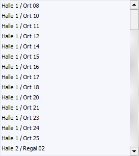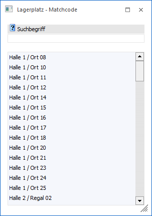 In der Tabelle werden nach Auslösen der Suche (Button "Anzeigen" oder Suchbegriff bestätigen) die gefundenen Lagerplätzeit ihrem Namen angezeigt. Per Doppelklick oder Enter-Taste kann der ausgewählte Platz anschließend in das Ausgangsfenster übernommen werden.