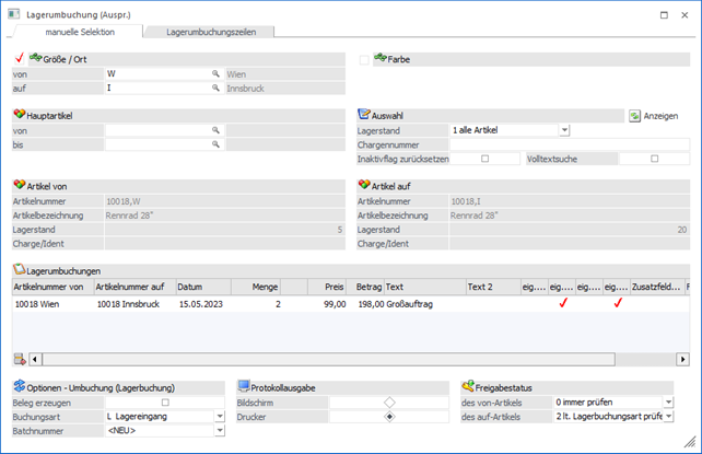 In dem Register "manuelle Selektion" können Ausprägungsartikel von einer Ausprägung (Lager, Charge, Identnummer, usw.) auf eine andere Ausprägung umgebucht werden.