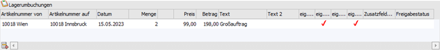 An dieser Stelle können 2 Umbuchungstexte (jeweils 50-stellig) hinterlegt werden. Diese Texte werden beim Buchen in der entstehenden Artikeljournalzeile übernommen.