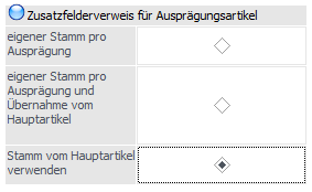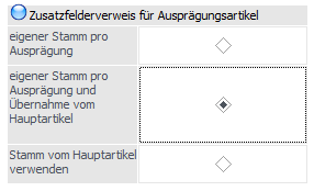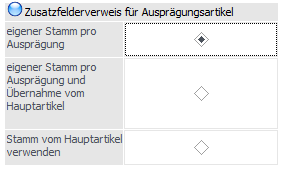 Steht der Radiobutton auf "eigener Stamm pro Ausprägung und Übernahme vom Hauptartikel", sind die Checkboxen "Zusatzfelder übernehmen" und "eig. Zusatz" standardmäßig aktiviert.