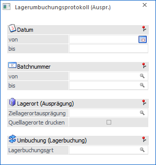 Über dieses Feld kann auf den Lagerort (die Ausprägung) eingeschränkt werden, auf welchen Umbuchungen vorgenommen wurden. Über die Matchcode-Funktion kann nach allen Lagerorten gesucht werden (das sind jene Ausprägungen, die mit der Option "Ausprägungen als Lagerorte" versehen sind).