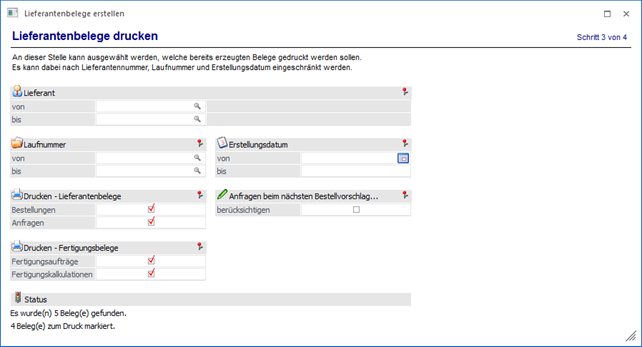 In dem Bereich "Lieferantenbelege drucken" kann ausgewählt werden, welche bereits erzeugten Belege als Anfrage bzw. Bestellung im Anschluss gedruckt werden sollen.