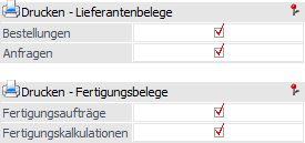 Durch Aktivieren der entsprechenden Optionen kann festgelegt werden, ob Lieferantenbestellungen und / oder Lieferantenanfragen gedruckt werden sollen.