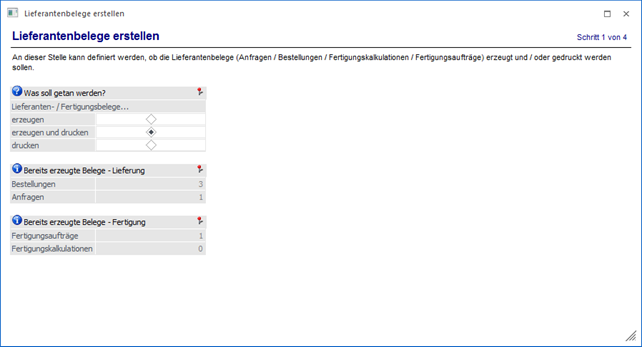 Wurde eine Auswahl getroffen, so kommt man durch Drücken des Buttons "Vor" zum nächsten Bereich des Assistenten. Welcher dieses ist, ist abhängig von der zuvor getroffenen Einstellung. Bei den ersten beiden Auswahlen kommen man jeweils zum Bereich "Lieferantenbelege erzeugen", bei "drucken" zu dem Bereich "Lieferantenbelege drucken".