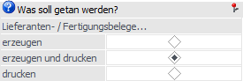 In dem Bereich "Lieferantenbelege erstellen" wird zunächst definiert, ob Lieferanten- bzw. Fertigungsbelege erzeugt und / oder gedruckt werden sollen.