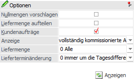 Durch Aktivierung werden die Option "Anzeige", "Liefermenge" und "Lieferterminänderung" freigeschaltet. Zusätzlich ist die Option "Kundenaufträge anzeigen" die Grundvoraussetzung zur Nutzung der Tabellenbuttons "Lieferdatum ändern" und "Liefermenge zuweisen".