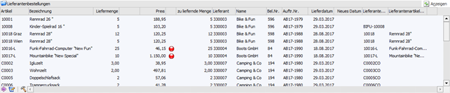 Durch Ausführung der Anzeige wird die Tabelle gemäß der zuvor getroffenen Selektion gefüllt. Die Bestellzeilen werden hierbei nach Lieferant, Artikelnummer und Datum sortiert. Die Sortierung kann durch einen Mausklick auf die Spaltenüberschrift geändert werden.