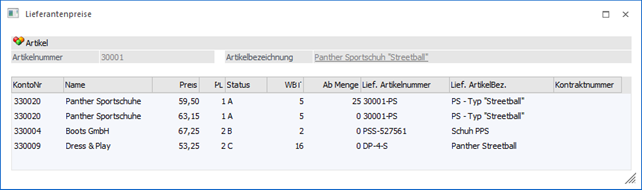 In der Tabelle werden alle Lieferanten mit den jeweiligen Preisinformationen aufgelistet, welche zum gewählten Lieferdatum gültige Preise aufweisen.