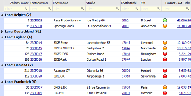 Es wird in einer Debitorenliste nach der vorhandenen Spalte "Land" gruppiert.