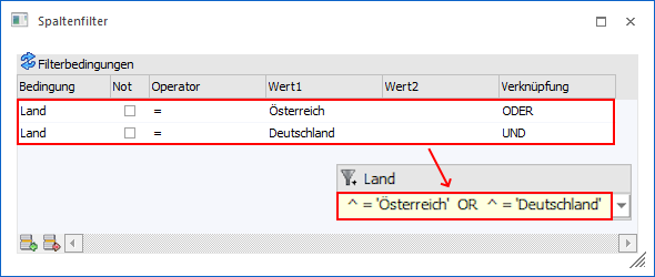 Über den Button "Spalte filtern" kann mit Hilfe des Fensters "Spaltenfilter" innerhalb der Spalte nach selbst zu definierenden Datenbereichen gefiltert werden (nähere Informationen siehe Kapitel "Spaltenfilter").
