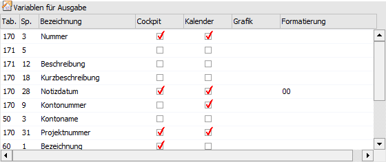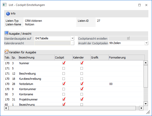 Mit Hilfe der Spalte "Cockpit" kann definiert werden, welche Spalten der Liste im Cockpit angezeigt werden sollen.