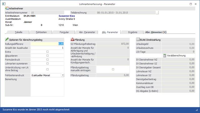 Durch Drücken der F5-Taste werden alle Änderungen gespeichert und es kann der nächste AN erfasst werden. Durch Anklicken des Netto-Buttons wird die Abrechnung des Arbeitnehmers gestartet. Durch Anklicken des "Neu Einlesen"-Buttons werden die Abrechnungsparameter gemäß den aktuellen Einstellungen im AN-Stamm nochmals übernommen. Davon betroffen sind die Felder