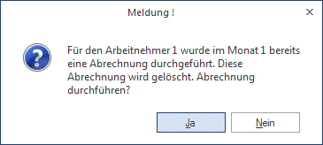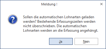 Wird die Meldung mit Ja bestätigt, werden die automatischen Lohnarten (inkl. Formeleingaben) abgearbeitet. Dabei werden bestehende Lohnarten aber nicht überschrieben. Wird die Meldung mit Nein bestätigt, dann bleiben die vorhandenen Erfassungszeilen bestehen, es erfolgen keine Änderungen.
