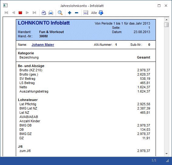 Im Jahreslohnkonto - Infoblatt werden alle abgerechneten Werte der bereits abgeschlossenen Perioden des aktuell aufgerufenen AN angezeigt. Die aktuelle Abrechnung ist in diesen Werten nicht enthalten.