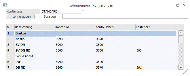 Durch Anklicken des Registers "Sonstige" können die allgemeinen Kontierungen wie Brutto, Netto, SV-DN, SV-Gesamt, LST, KommSt etc. hinterlegt werden, wobei die Werte für SV-DG, DB, DZ, KommSt. und BV zwischen Normalzahlung und Sonderzahlung unterschieden werden können.