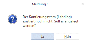 Sollen nun unterschiedliche Kontierungen (z.B. für ARB/ ANG) verwendet werden, so kann im Feld Kontierung einfach eine neue Bezeichnung eingegeben werden. Wird diese Eingabe bestätigt, wird folgende Meldung angezeigt: