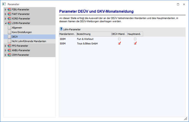 In der Spalte Hauptmandant legen Sie fest, in welchem Mandanten Sie die DEÜV-Ausgabe durchführen möchten. In diesem Mandanten ist das Stammdatenprogramm zur Einrichtung der DEÜV, der DEÜV-Stamm, unter dem Menüpunkt