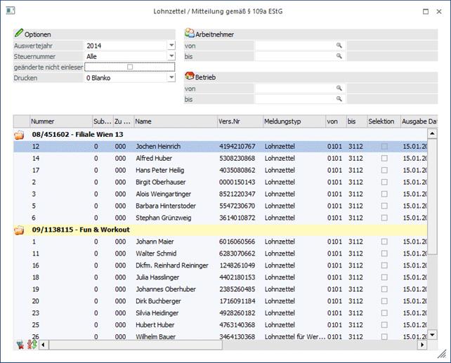 Durch Anklicken des Anzeigen-Buttons (oder Tastenkombination ALT + Z) werden alle AN gemäß der Selektion in der Tabelle angezeigt. Durch Anklicken des Buttons "Nur Austritte" werden in der Tabelle nur jene AN angezeigt, die in einer Vorperiode ausgetreten sind und für die noch kein L16 ausgestellt wurde.