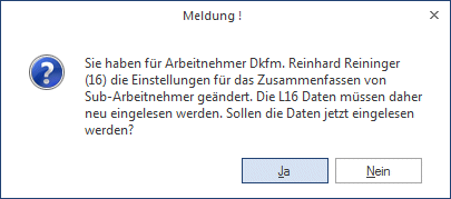 angezeigt. Wird diese Meldung mit JA bestätigt, dann werden die Werte neu eingelesen. Wird die Meldung mit NEIN bestätigt, wird auch die Zuordnung der SUB-AN-Nr. rückgängig gemacht.