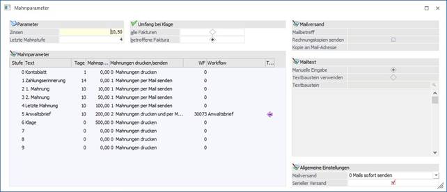 werden die Mahndaten (wann wird gemahnt, Höhe der Mahnspesen, Verzugszinsen %, etc.) festgelegt.