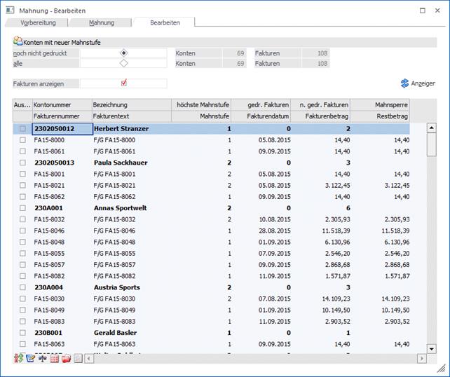 Werden über die Fakturenänderung bei den Fakturen eines Kontos die Checkboxen "neue Mahnstufe" deaktiviert (um evtl. Mahnstufen manuell zu verändern), so wird dieses Konto nicht mehr in der Tabelle angezeigt.