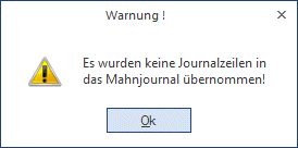 Wenn aufgrund der Prüfung der Mahnparameter keine Journalzeilen in das Mahnjournal übernommen wurden, erfolgt keine Anzeige und Sie erhalten eine Informationsmeldung angezeigt.