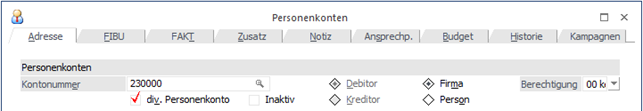 Ist ein Personenkonto im Personenkontenstammblatt als "diverses Personenkonto" gekennzeichnet, kann im Mahnwesen trotzdem jede Adresse einzeln gemahnt werden, sofern in der Belegerfassung / Faktura auch die entsprechenden Adressen eingetragen worden sind und die Belege noch nicht durch Reorganisieren eliminiert worden sind.
