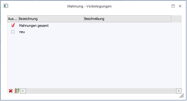 Im Matchcodefenster der Mahnung - Vorbelegungen werden alle angelegten Vorbelegungen angezeigt.