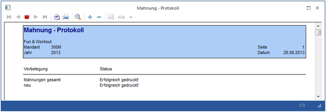 Wurden mehrere Vorbelegungen ausgewählt, werden diese durch Betätigen des Ausführen-Buttons gemeinsam abgearbeitet und automatisch an den Drucker oder Spooler ausgegeben. Sie erhalten ein Protokoll mit Auflistung aller ausgewählten Vorbelegungen gedruckt.
