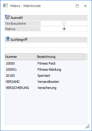 Wenn der Fokus in dem Feld "Makronummer" liegt und das Lupen-Symbol bzw. die Taste F9 gedrückt wird, dann öffnet sich das Programm "Makro - Matchcode". An dieser Stelle kann gezielt nach Makros bzw. Textbausteinen gesucht werden.