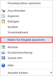 Dieser Button wird während der Wiedergabe eines Makros automatisch aktiviert, wenn in dem Makro eine Eingabe definiert wurde. Das Makro kann nach der Eingabe mit Hilfe der Taste F11 oder durch Anwahl des Buttons "Makro Aufzeichnung pausieren" fortgesetzt werden.
