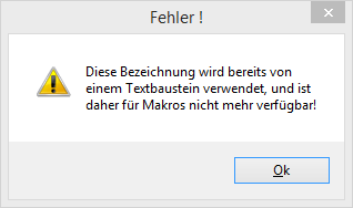 Es werden bei Makros und Textbausteinen dieselben Nummern verwendet. Wenn an dieser Stelle eine Nummer verwendet werden soll, welche bereits bei den Textbausteinen genutzt wird, dann erscheint folgender Hinweis: