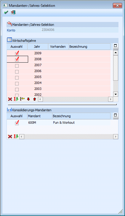 Wird auch die Konzernkonsolidierung verwendet, wird das Fenster "Mandanten-/Jahres-Selektion" erweitert, aber auch nur dann, wenn in den Konsolidierungseinstellungen die Optionen "Manuelle Mandanten-Selektion bei Neuanlage" und "Manuelle Übernahme in den Submandanten" ausgewählt sind.