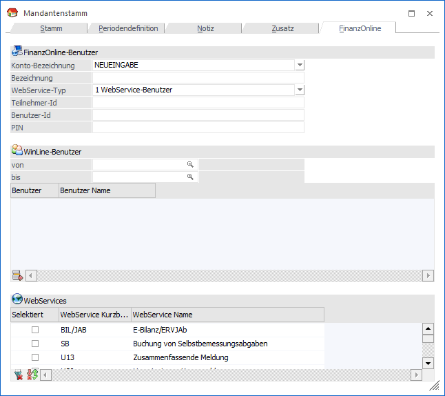 Jeder WinLine-Benutzer ist für jede Finanzamt-Meldung über WebService nur einem FinanzOnline-Benutzer zugeordnet.