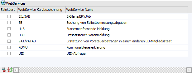 In der WebServices-Tabelle ist es möglich für jene oben angeführten WinLine Benutzern, die Finanzamt-Meldungsarten auszuwählen, welche direkt über WebService an das FinanzOnline Portal übermittelt werden sollen. Die Auswahl steht dementsprechend nur für Benutzern des Typs "1 - WebService-Benutzer" zur Verfügung.