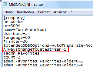 Wenn immer in das höchstmögliche Wirtschaftsjahr gewechselt werden soll, dann muss ein Eintrag in der Datei "mesonic.ini" erfolgen (unter [company] der Eintrag "AlwaysChangeToLatestYear=1").