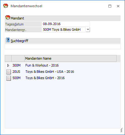 Hier muss der Mandant ausgewählt werden, der bearbeitet werden soll, wobei immer der zuletzt bearbeitete Mandant vorgeschlagen wird. Um einen anderen Mandanten auszuwählen, gibt es mehrere Möglichkeiten: