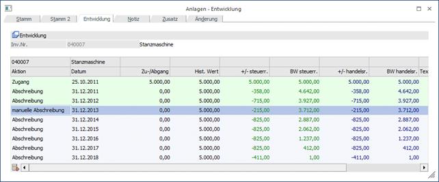 Die Historienzeile mit der manuellen Abschreibung wird aktiviert