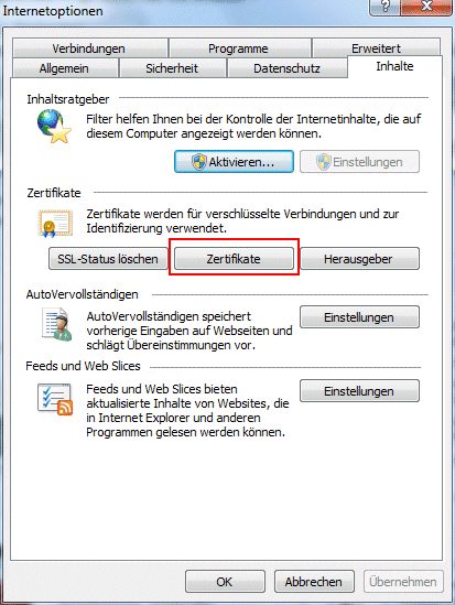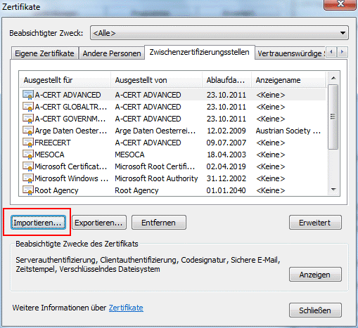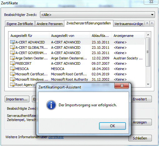 Der Import der Zertifikate kann z.B. im Internet Explorer/Internetoptionen/Inhalte/Zertifikate (siehe dazu auch unter Kontrolle im Internet-Explorer) erfolgen.