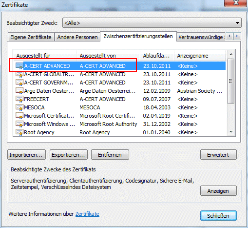 In der angezeigten Liste muss sich der Eintrag "A-CERT ADVANCED" ausgestellt von "A-CERT ADVANCED" befinden.