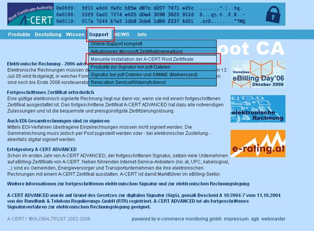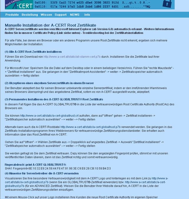Auf der Internet-Seite von A-Cert gibt es im Bereich Support den Eintrag "Manuelle Installation der A-CERT Root Zertifikate"; oder auch aufzurufen unter http://www.a-cert.at/php/cms_monitor.php?q=PUB-TEXT-A-CERT&s=08305wjt.