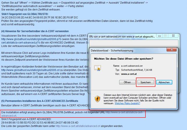Um das Zertifikat "A-CERT ADVANCED" installieren/importieren zu können, muss dieses zuerst gespeichert werden.