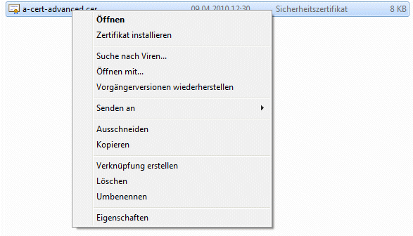 Dazu muss die Datei mittels rechter Maustaste angewählt und der Eintrag "Zertifikat installieren" im Kontextmenü gewählt werden: