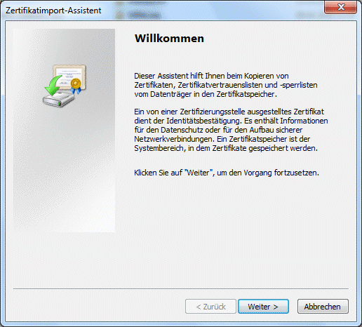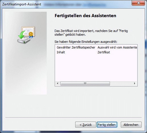 Dadurch öffnet sich der Zertifikatsimport-Assistent in dem der erste und zweite Schritt mit "Weiter" bestätigt werden muss, und im letzten Schritt der "Fertig stellen"-Button gedrückt werden muss.