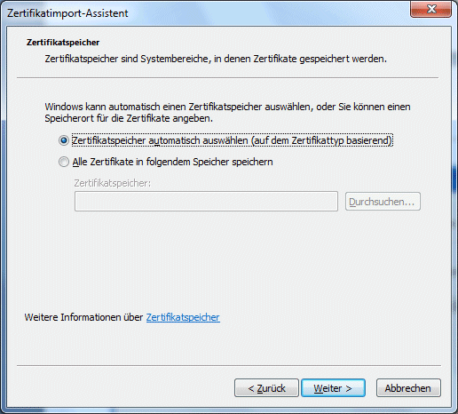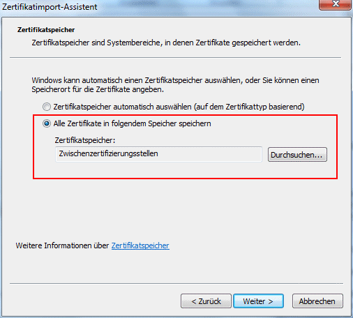 Hier muss als Zertifikatsspeicher "Zwischenzertifizierungsstellen" angegeben werden.