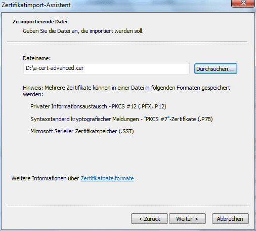 Es öffnet sich dadurch wieder der Zertifikatsimport-Assistent in dem im zweiten Schritt die zu importierenden Datei angegeben werden muss: