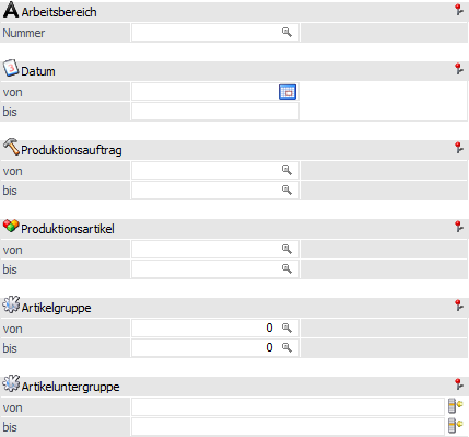 Mit Hilfe des Arbeitsbereichs können gewisse Einschränkungen, wie z.B. Produktionsauftrag und Produktionsartikel, automatisch vorbelegt werden.