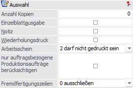 Über die Option "Arbeitsschein" in den PPS-Parametern (Bereich "Ausgabe") kann die Selektion in diesem Feld vorbesetzt werden.
